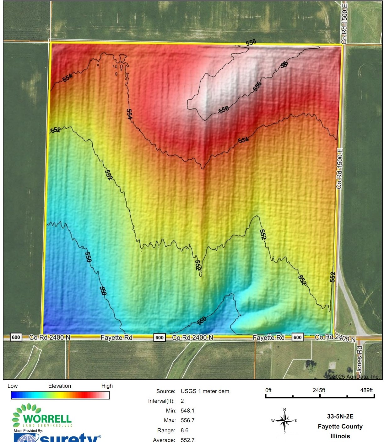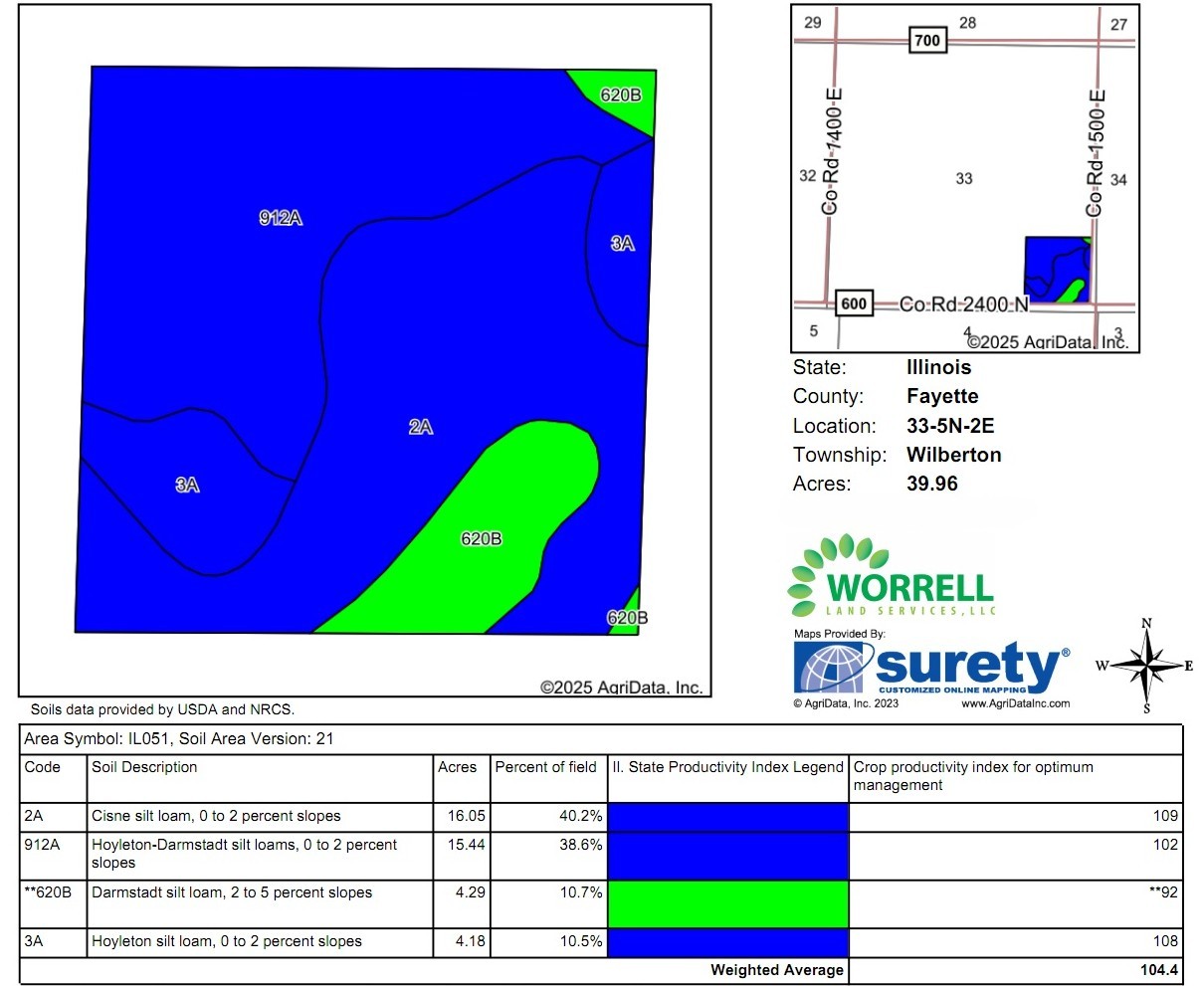 Property Location & Directions: Property is located in Southern Fayette County. Head South on Hwy 51 out of Vandalia then East on E 900 then South on 1500. The farm is at the corner of Fayette and 1500 in Fayette County, IL Section 33 – Township 5N – Range 2E.